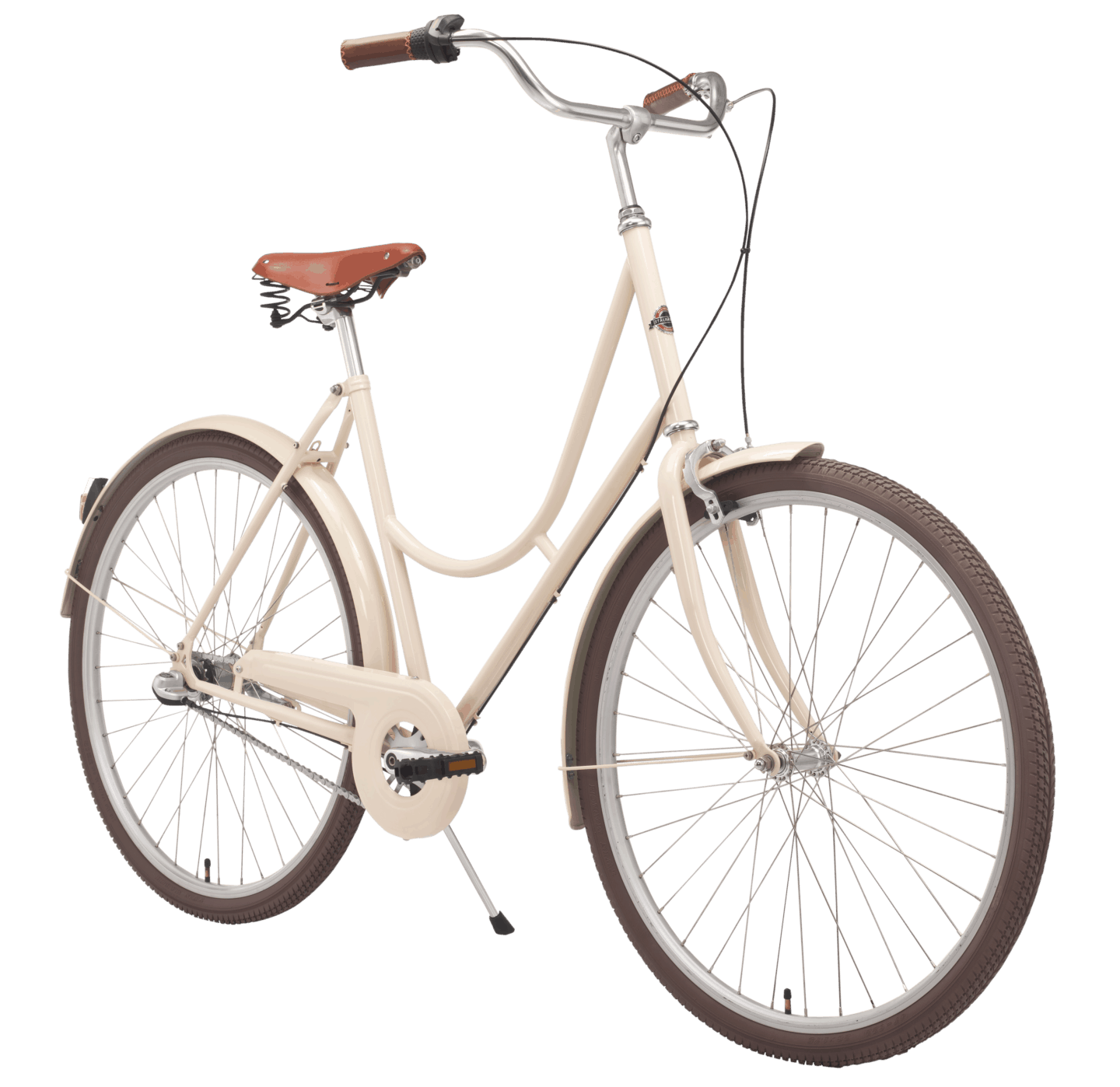 Cream coloured frame, leather seat, brown stitched grips and classic design.Stylish as few with a cream coloured steel frame, large, easy-to-ride 28 "wheels, handbrake and foot brake. Coaster brakes and hand brakes Also comes with 3 speeds, which makes it a bit easier to climb up the hills.