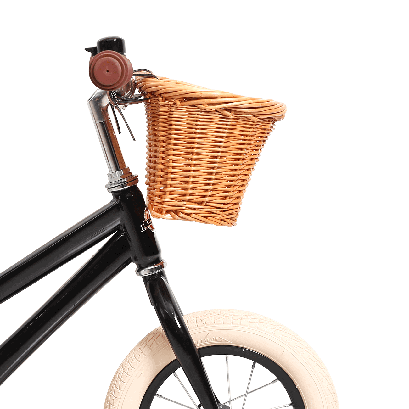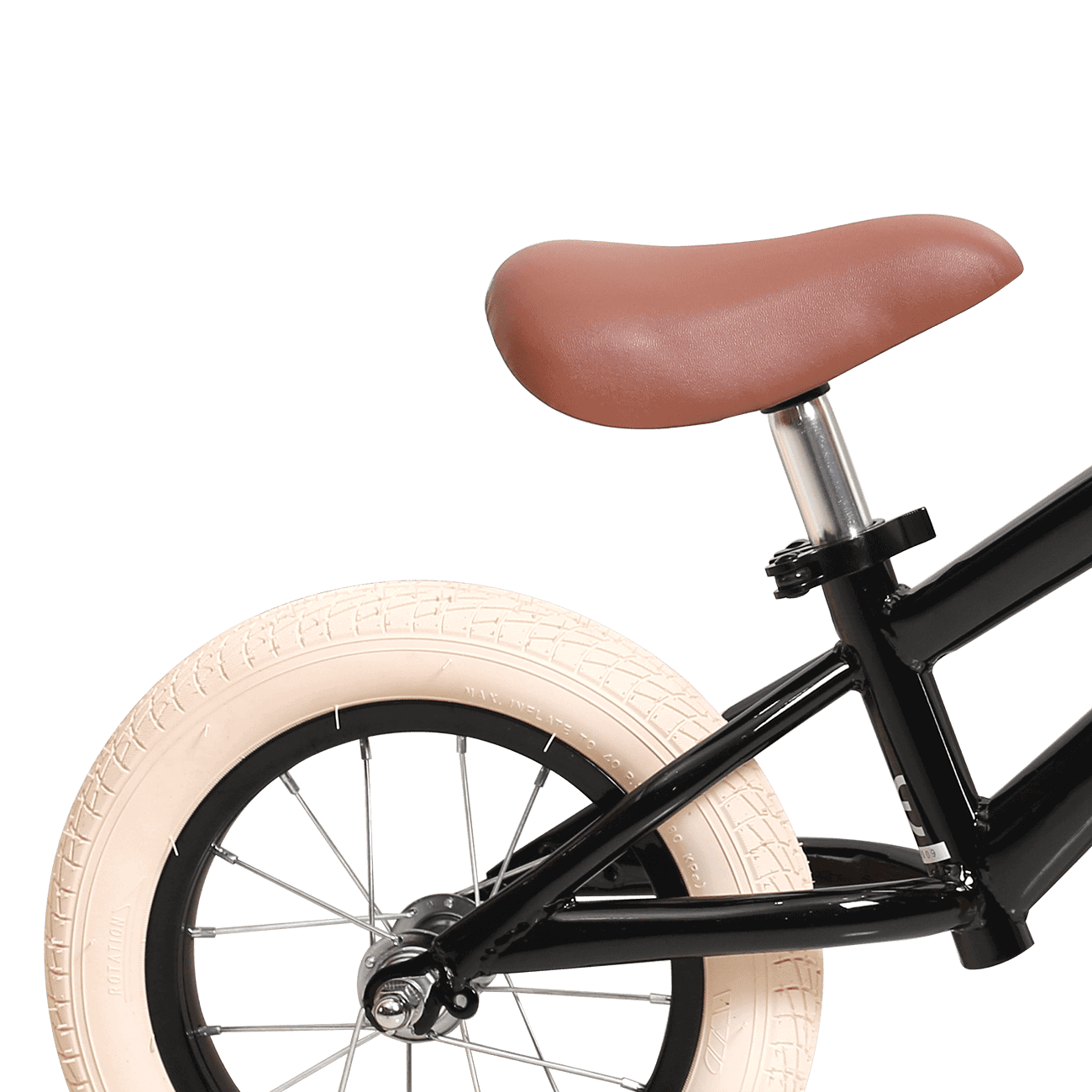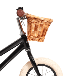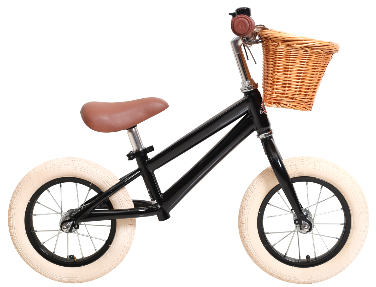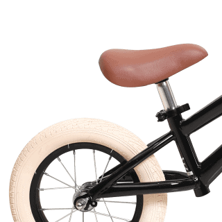 In mini format, this titbit has the same lovely design and quality as our adult bikes. Shiny black frame with matching rims and bell. Brown saddle and beige rubber tires. Tough!