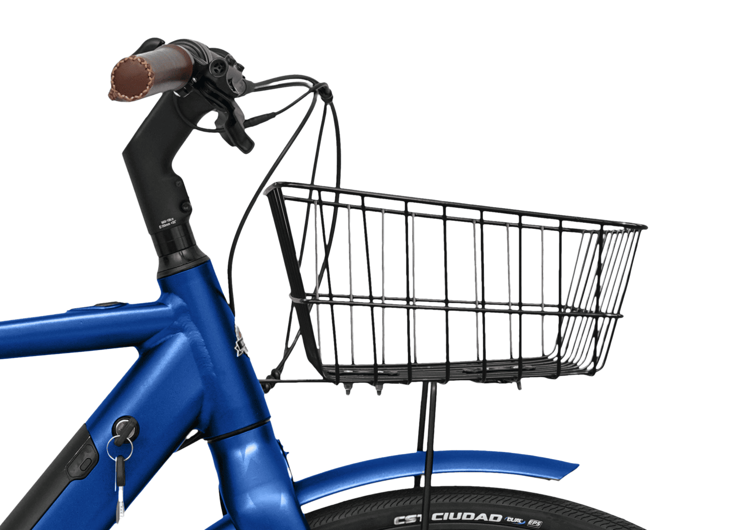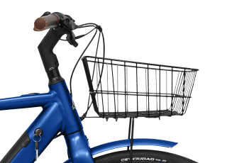 Levereras komplett med korg i rostfritt stål, stänkskärmar, fotstöd, ramlås och integrerad belysning.